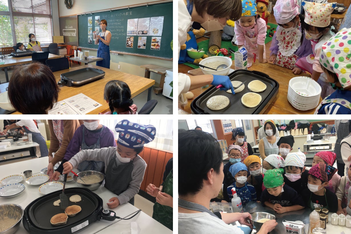 これまでに保育施設、小・中学校を中心に300回以上実施してきた「おやこdeパンケーキ」は、九州パンケーキの焼き方、楽しみ方を親子で体験していただく料理教室です。食育の時間では、九州パンケーキの素材について、農家さんのインタビューなどをご紹介し、地元の野菜や果物をトッピングで使用し調理いたします。